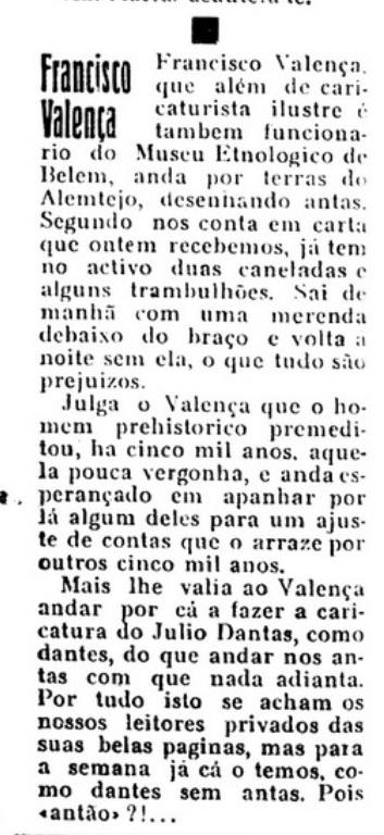 Mais lhe valia ao Valença andar por cá a fazer a caricatura do Júlio Dantas, como dantes, do que andar nas antas com que nada adianta. Por tudo isto se acham os nossos leitores privados das suas belas páginas, mas, para a semana, já cá o temos como dantes e sem antas. Pois 'Antão'?»